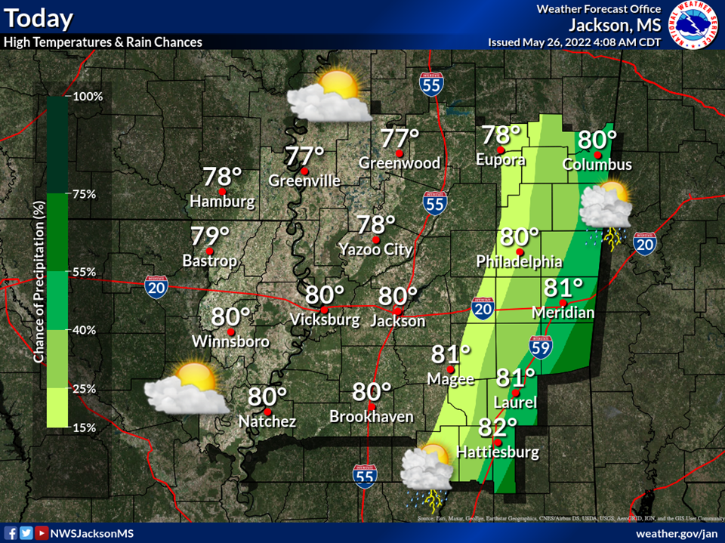South southeast wind 10 to 15 mph with gusts as high as 20 mph. Weathergov Jackson Mississippi National Weather Service Jackson Mississippi - Climate Data. Mostly cloudy with a low around 66.